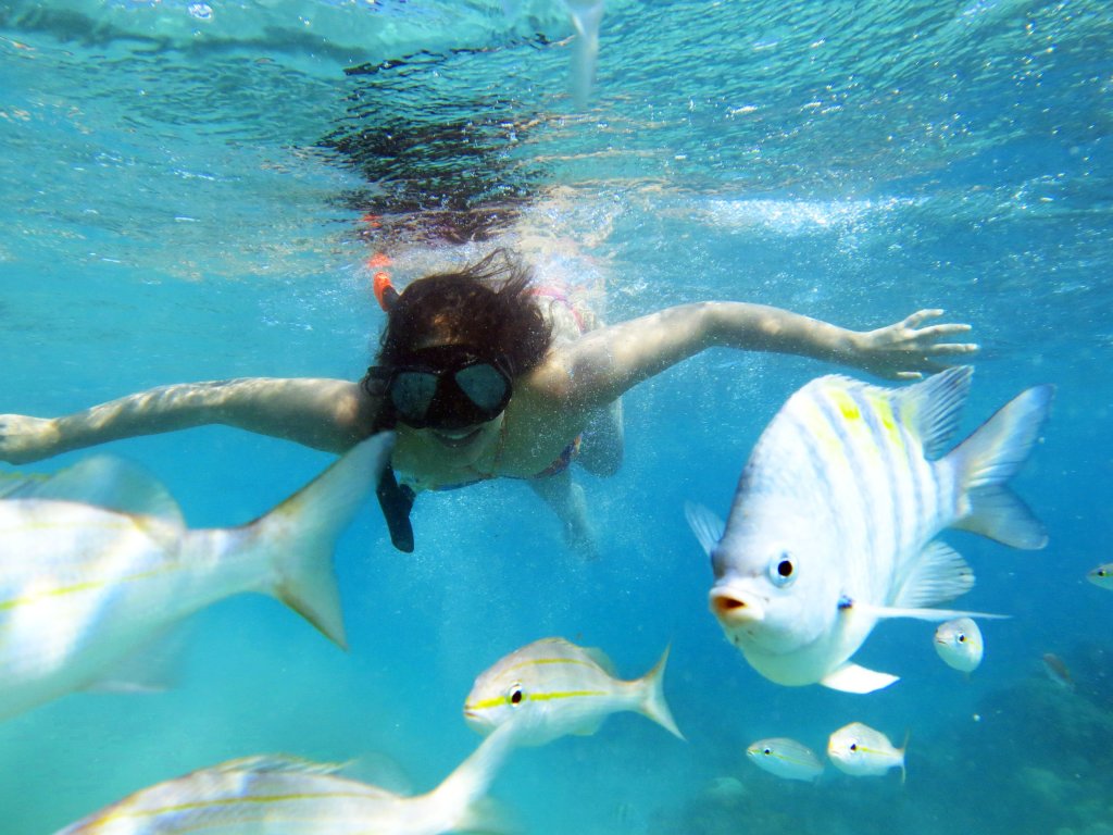 Pegamos o barco bem cedo e chegando lá caímos na água com os peixinhos.