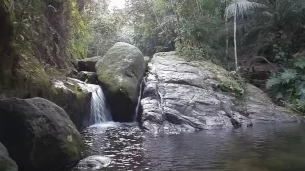 A cachoeira tem esse nome por causa de um buraco no meio das rochas que os visitantes escorregam para acessar uma piscina do outro lado.